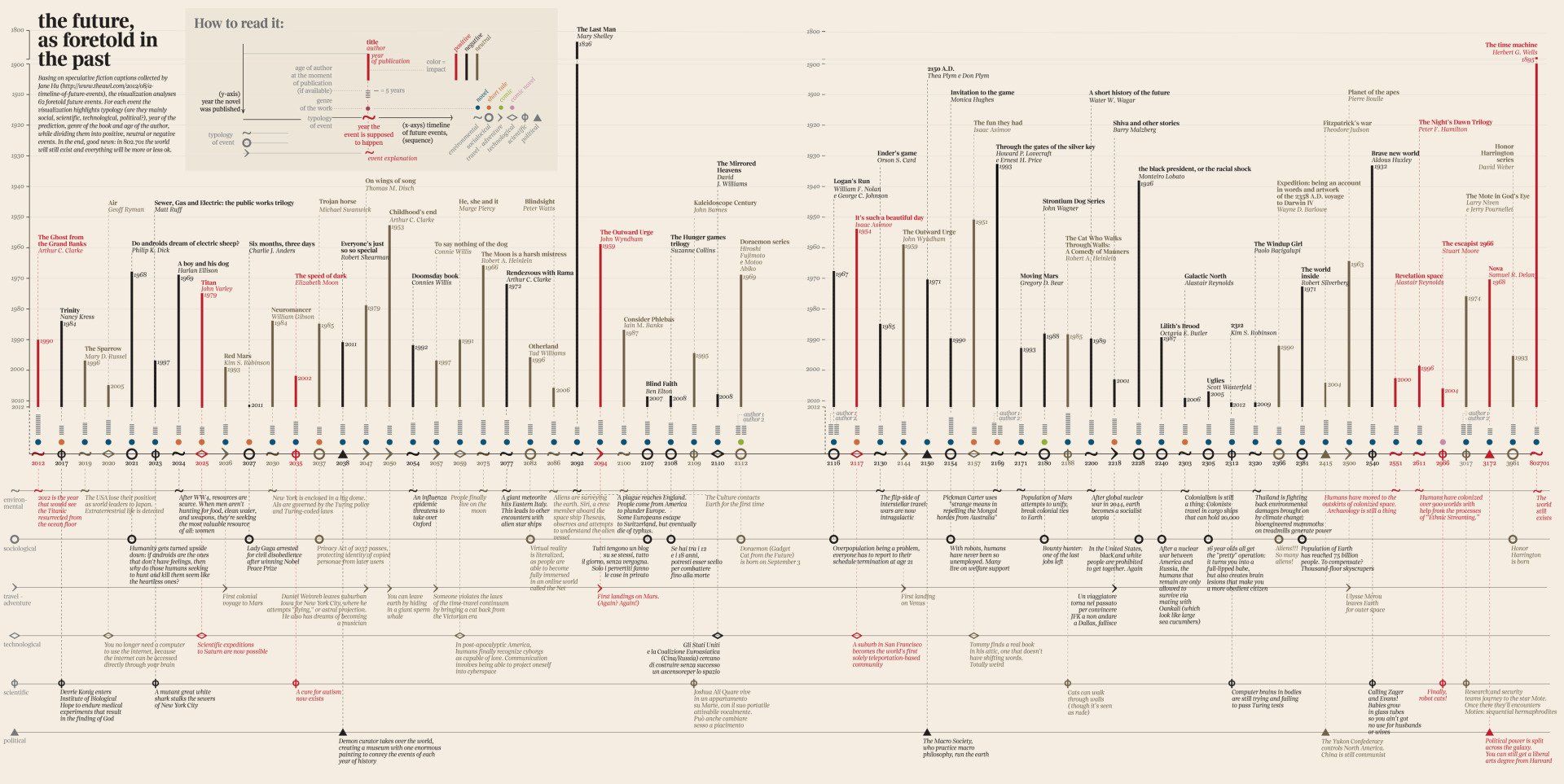 En 2012, l’AWL avait compilé une liste exhaustive des prédictions puisés dans les romans de science-fiction et des histoires, à commencer par la résurrection du Titanic depuis le plancher océanique, comme décrit dans Le Fantôme venu des profondeurs de Arthur C. Clarke. Depuis, nous disposons d’une chronologie bien plus détaillée. Il y a quelques mois, Giorgia Lupi, un designer d’information italien, a créé une infographie des données. La conception de Lupi donne une meilleure idée de l’avenir immense qui s’étend dans les récits — avec l’optimisme de nos écrivains qui entrevoit l’humanité toujours présente dans l’année 802701 !